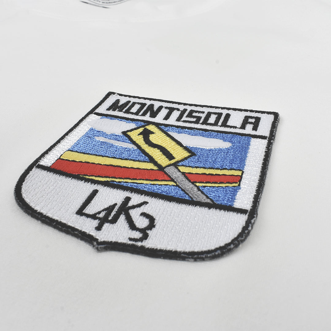 胸元には「L4K3」と「Monte Isola (モンテ・イーゾラ)」のロゴが入ったワッペンと袖口には刺繍をあしらったベーシックなTシャツです。 - サイズ