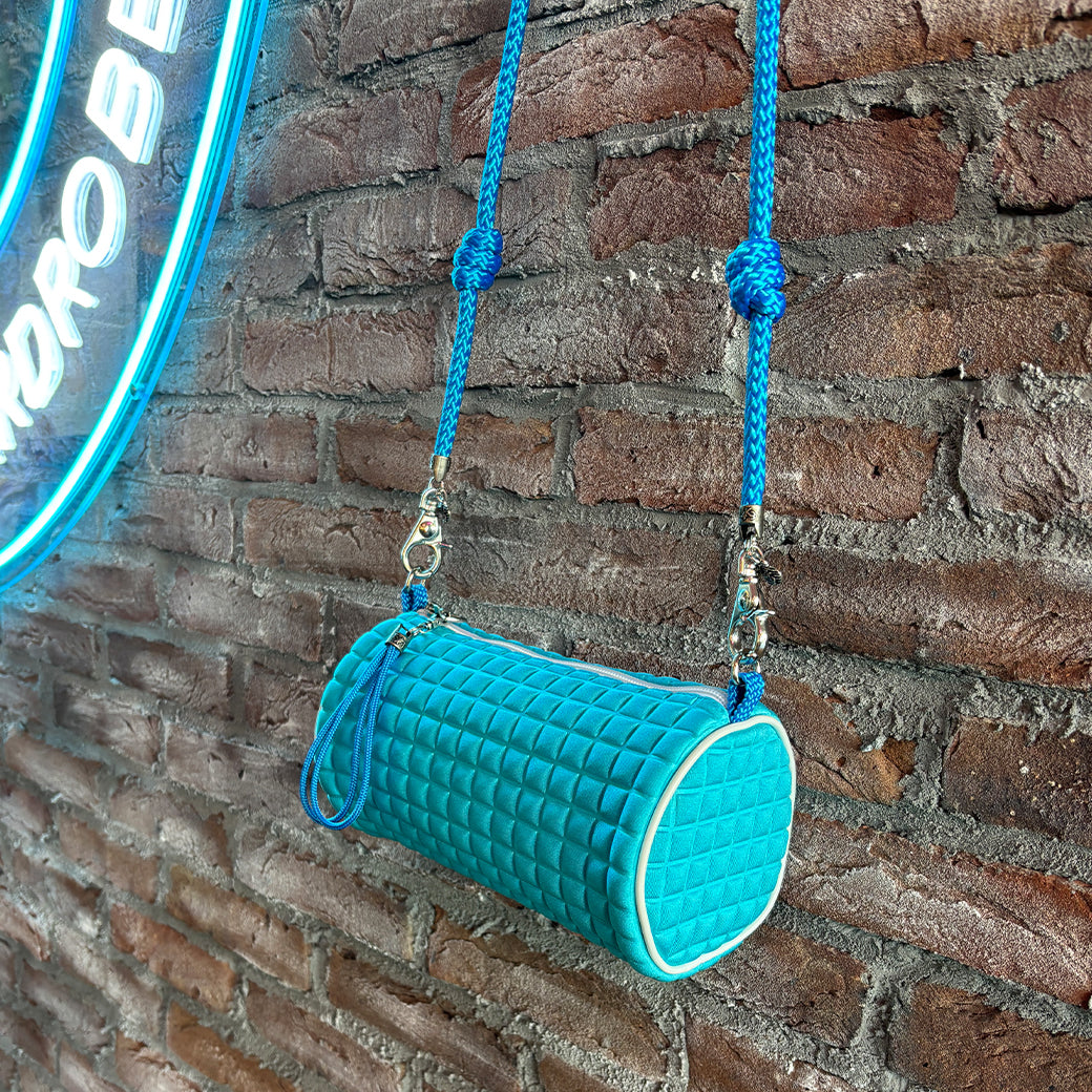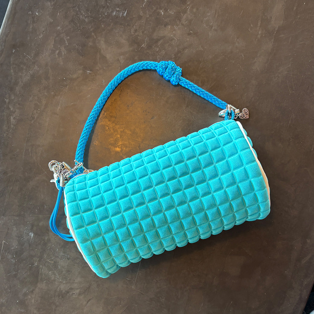 鮮やかなターコイズブルーのボディに、立体的なキューブエンボスを施した一品。