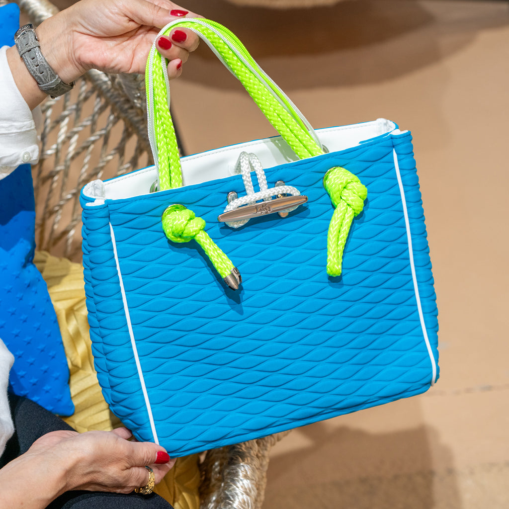 トート ミニ - バッグの生地にはウェットスーツにも使える柔軟で丈夫なネオプレン素材を使用。